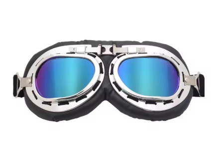 This pair of goggles, they have a shiny silver-coloured lens around, tinted grey lens and a soft, faux leather padded mask section. They are hinged, making them completely foldable and have a fully adjustable elastic head strap.