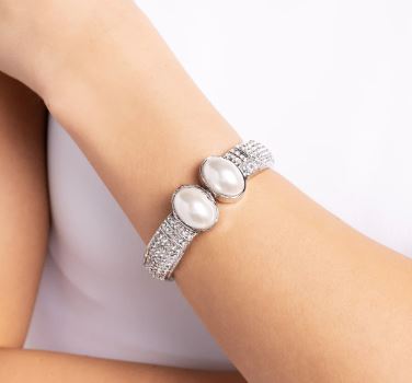 Featuring oversized white pearls, two shiny silver bars embellished with row after row of white rhinestones attach to a spring-like fitting as they curl around the wrist for a refined finish. Features a hinged closure.