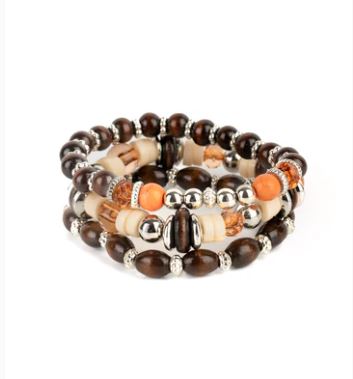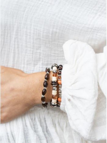 A mismatched collection of brown wooden beads, silver accents, orange stones, Buttercream discs, and glassy Desert Mist beads are threaded along stretchy bands, creating colorful layers around the wrist.