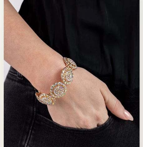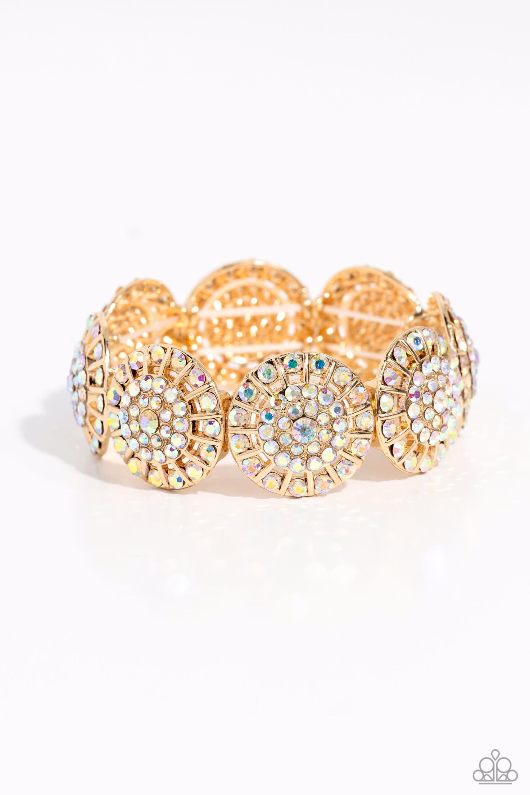 Adorn your wrist with elegance through a captivating wheel design, where concaved gold discs are intricately embossed and surrounded by a vibrant burst of iridescent rhinestones. This stretchy band offers a perfect fit, enhancing its dazzling allure. Embrace the beauty of a prismatic spectrum, as each piece may exhibit a delightful variation in color, ensuring uniqueness in every wear.