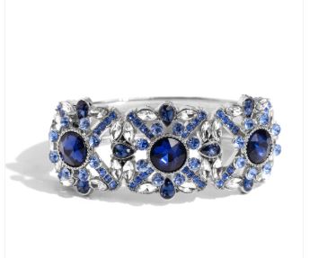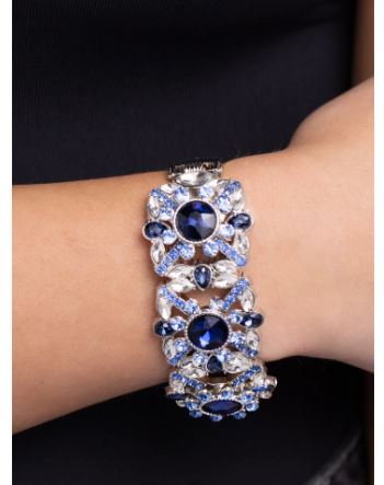 Various blue and white rhinestones in round, teardrop, and marquise cuts sparkle atop airy, silver frames, connected to a silver bangle-like bracelet around the wrist for a jaw-dropping dazzle. Features a hinged closure.