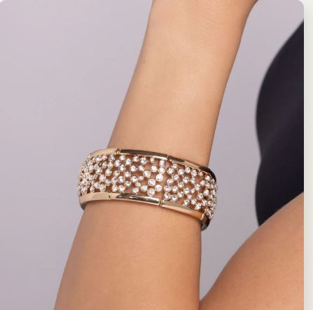 Adorning the wrist with elegance, this exquisite bracelet features a harmonious arrangement of white rhinestones nestled within circular settings. Scattered gracefully between two shimmering, curved gold bars, the sparkling gems dance in the light, their brilliance enhanced by the stretchable elastic bands. This captivating design creates a stunning visual display, perfect for adding a touch of glamour to any ensemble.