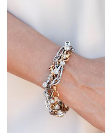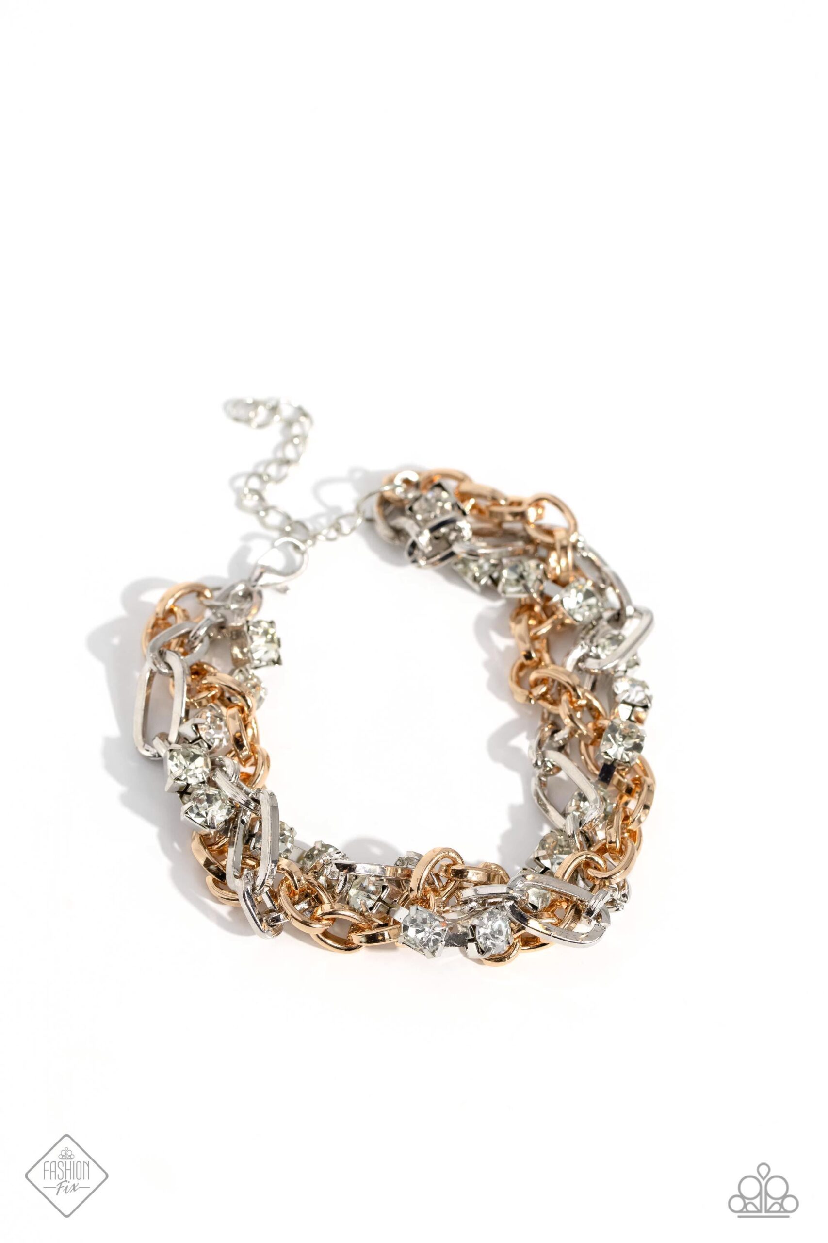 Mismatched strands of glistening gold and silver oval links are intertwined with a row of sparkling, square-cut, white rhinestones encased in sleek silver fittings, resulting in a twisted collision of grit and glamour around the wrist. Features an adjustable clasp closure.