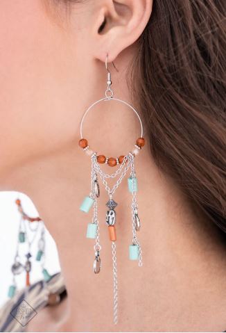 Infused along the bottom of a silver wire hoop, an earthy collection of cloudy and milky Tomato Cream beads and silver wheel beads give way to a cascade of silver coins, cylindrical turquoise stones, textured beads, cylindrical Tomato Cream beads, and layers of tapered silver chains, resulting in an eclectic fringe. Earring attaches to a standard fishhook fitting. As the stone elements in this piece are natural, some color variation is normal.