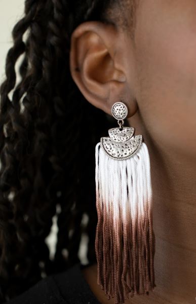 Gradually fading from white to brown, shiny cording streams from the bottom of hammered silver frames, creating a colorful fringe. Earring attaches to a standard post fitting.