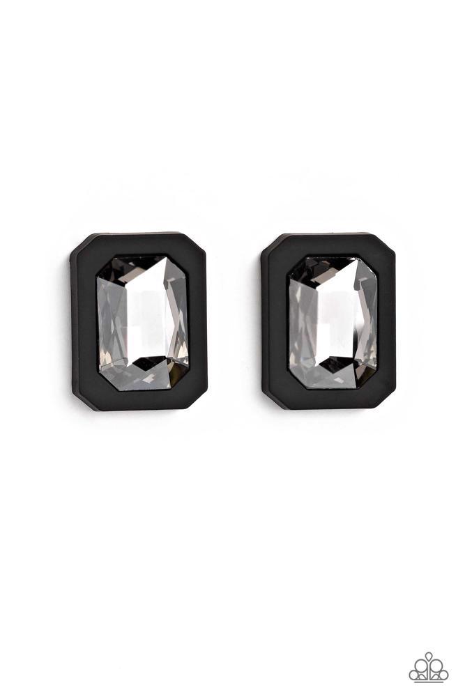 Standing out against a black rubber backdrop, an oversized, faceted emerald-cut gem shimmers and shines for an edgy sparkle against the ear. Earring attaches to a standard post fitting.