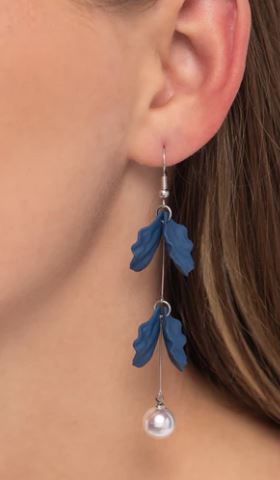 A glossy white pearl delicately links to the bottom of a sleek silver rod. Navy acrylic petals cascade along the silver rod, adding a timeless twist to the classic pearl palette. Earring attaches to a standard fishhook fitting.