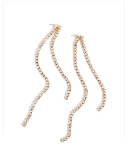 Encased in glistening gold fittings, dainty strands of glittery white rhinestones delicately attaches to a double-sided post cascading below and peeking out beneath the ear for a twinkly look. Earring attaches to a standard post fitting.