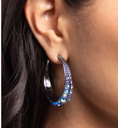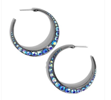 The front-facing surface of a chunky gunmetal hoop is dipped in layers of brilliantly sparkling sapphire iridescent rhinestones that gradually increase in size towards the center of the hoop while light-catching gunmetal studs frame the ends for a blinding finish. Earring attaches to a standard post fitting. Hoop measures 1 3/4″ in diameter. Due to its prismatic palette, color may vary.