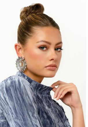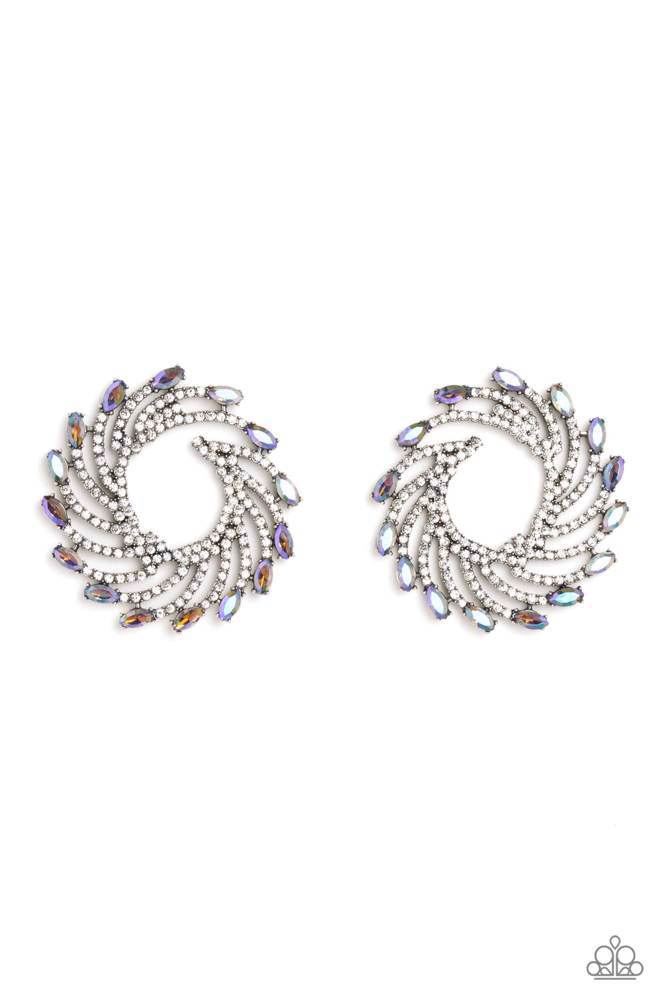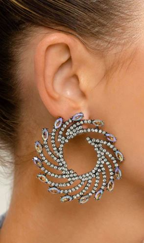 Shimmery strands of silver spin out from an airy center, creating an exaggerated firework-like display at the ear. An explosion of dainty white rhinestones lines the swirls and curves of the shimmery display leading the eye to the collection of colorfully reflective marquise-cut gems at its ends. Each colorfully reflective marquise-cut gem curls around the ear in a clock-like manner, creating additional eye-catching dimension. Earring attaches to a standard post fitting. Due to its prismatic palette, color may vary.