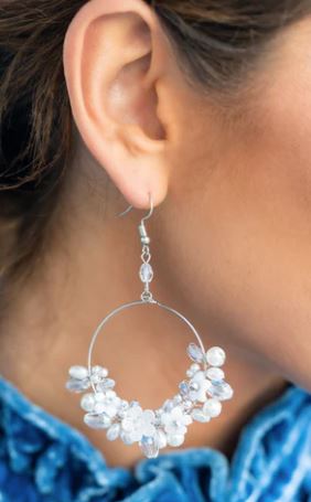 A timeless collection of iridescent crystal-like accents, dainty white pearls, and white floral frames delicately cluster along the bottom of a silver hoop, creating a glamorous glow. Earring attaches to a standard fishhook fitting.