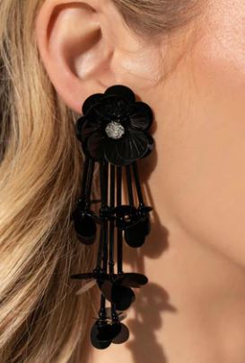 Blooming from a faceted white gem center, textured black sequin petals give way to a collection of black cylindrical beaded strands that elongate the neck. Sporadically bursting amongst the strands, a collection of simple black sequins flicker and flash for additional eye-catching interest. Earring attaches to a standard post fitting.