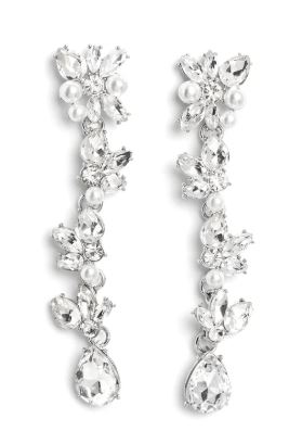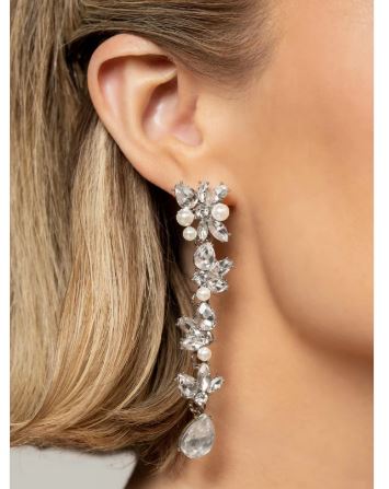 Radiant clusters of white reflective teardrop, marquise-cut and round gems combine with classic white pearls to create an explosion of glitz that extends down the ear. Hanging from the bottom of the light-reflecting earring, a white, reflective teardrop gem swings for some eye-catching shimmer against a backdrop of high-sheen silver. Earring attaches to a standard post fitting.