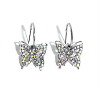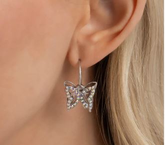 A small, skinny, shiny silver hoop curves around the ear in a timeless fashion. A shiny silver ball is affixed to the end of the hoop, reminiscent of a barbell fitting. An iridescent rhinestone-encrusted butterfly frame, layered in front of a shiny silver airy butterfly frame, slides along the curvature of the hoop, adding a whimsical hint of shimmery movement. Earring attaches to a standard post fitting. Hoop measures approximately 1/2″ in diameter. Due to its prismatic palette, color may vary.