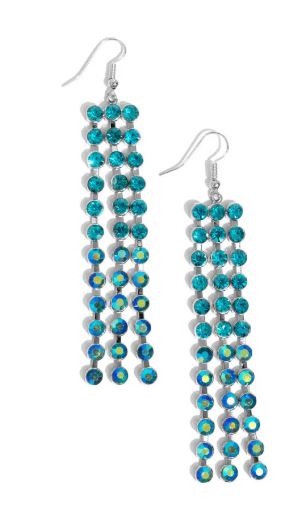 Pressed in circular fittings, a trio of gems fades from blue zircon to iridescent blue zircon for a shoulder-dusting, elongated ombré display. Earring attaches to a standard fishhook fitting. Due to its prismatic palette, color may vary.
