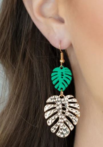 Palm Tree Cabana – Green is a tropical dream! A mint palm leaf perfectly complements a hammered gold palm leaf for an island-inspired look. These earrings feature a standard fishhook fitting for easy wear.