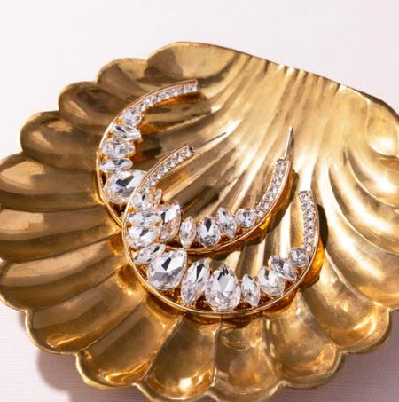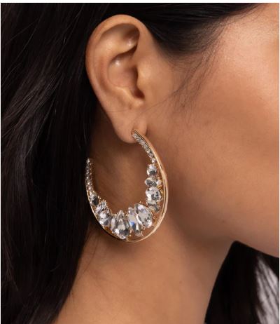The inner surface of a thin gold hoop features a row of white rhinestones in gold square fittings giving way to a collection of brilliantly sparkling white round, teardrop, and marquise-cut gems in gold-pronged fittings that gradually increase in size towards the center of the hoop for a blinding finish. Earring attaches to a standard post fitting. Hoop measures 2 1/2″ in diameter.