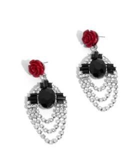 Featuring a Scarlet Smile hue, a glistening rosette post gives way to layers of white rhinestones in silver square fittings held together by trios of emerald-cut black gems surrounding a faceted black oval gem for a romantically rebellious look. Earring attaches to a standard post fitting.