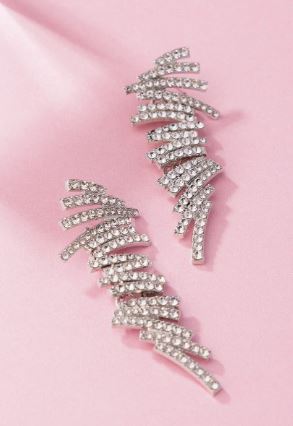 An icy stack of white rhinestone-embellished silver bars in varying sizes stagger and cascade below the ear, coalescing into a shockingly sparkly frame. Earring attaches to a standard post fitting.