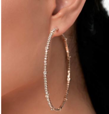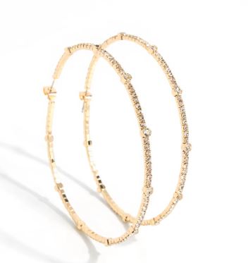 Sporadically interrupted by white rhinestones in rounded gold fittings, a collection of white rhinestones in gold square fittings is infused along an oversized gold wire hoop for a sensationally eye-catching display. Earring attaches to a standard post fitting. Hoop measures approximately 3″ in diameter.