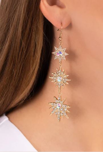 Adorned with shimmering iridescent and white rhinestones, this enchanting ensemble features a series of three-dimensional gold stars that gracefully increase in size, creating a celestial cascade from the ear. Securely attached to a standard fishhook fitting, these earring are a true statement piece. Please note that the vibrant colors may vary due to their prismatic design.
