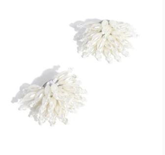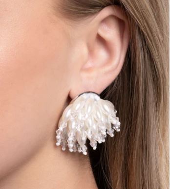 Exploding from a circular silver post, a collection of white pearly oval beads, white seed beads, and crystal-like faceted beads cascade in strands below the ear for an infatuated, Sunset-inspired statement. Earring attaches to a standard post fitting.