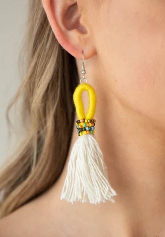 A trio of yellow suede tassels are knotted in place at the bottom of a wooden beaded frame, creating an earthy fringe. Earring attaches to a standard fishhook fitting.