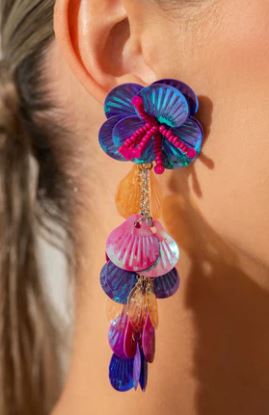 Featuring an iridescent hue, a collection of purple, pink, and orange sequins cascade from a collection of purple sequins that flourish from a hot pink seed beaded starfish for a coastal, chic look. Earring attaches to a standard post fitting. Due to its prismatic palette, color may vary.