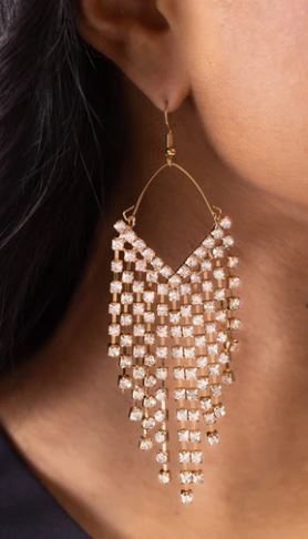 Attached to a dainty silver wire fitting, strands of glittery fuchsia rhinestones pressed in sleek silver fittings freefall from the ear into an edgy v-shaped cascade for a bold look. Earring attaches to a standard fishhook fitting.