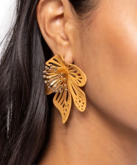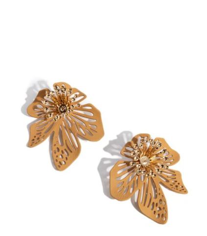 Featuring an oversized, airily textured Buckthorn Brown floral backdrop, a dainty 3D gold sunburst detail, glistening with rounded, concaved fittings stands out atop the ear for a sunny pop of color. Earring attaches to a standard post fitting.