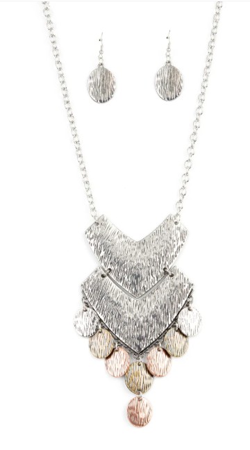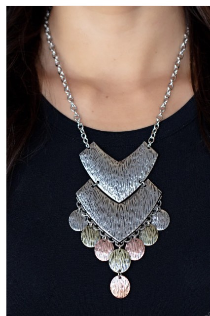 Etched in rustic silver textures, a pair of oversized chevron-like silver frames delicately link into a wild statement piece. Matching textured silver, brass, and copper discs swing from the bottom of the stacked display, adding a noisemaking movement to the rambunctious pendant. Features an adjustable clasp closure.