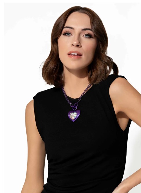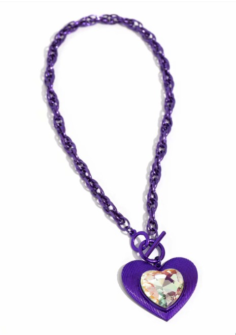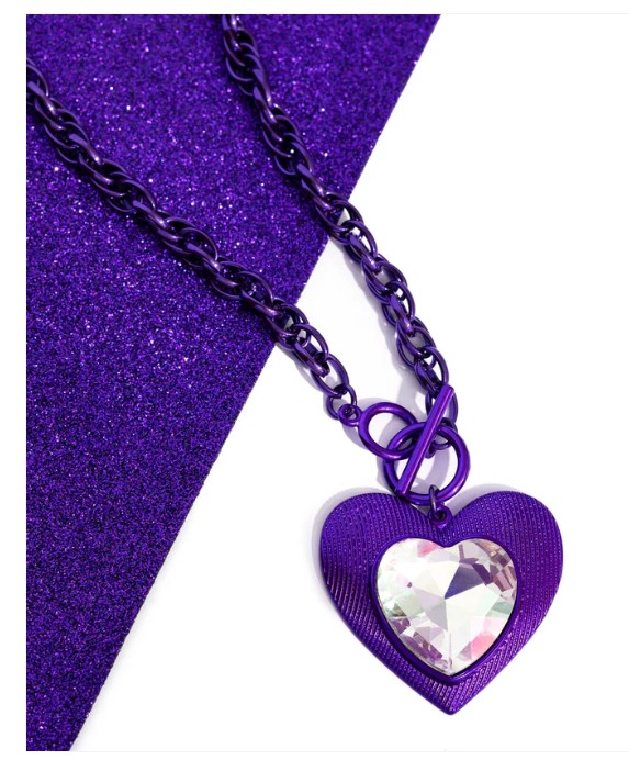 Bordered in linear textures, an oversized white heart gem is pressed into an electric purple heart frame below the collar. The flirtatious pendant attaches to a thick, electric purple chain, resulting in a modern-inspired romance. Features a lariat closure.