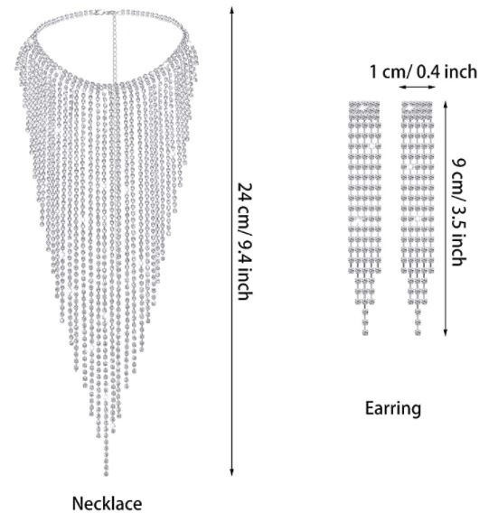 - Silver tassel necklace and earrings size: the total length of the girl tassel necklace is 66 cm/ 26 inch, the longest tassel is 24 cm/ 9.4 inch; Hanging tassel earrings is 9 cm/ 3.5 inch in length and 1 cm/ 0.4 inch in width.