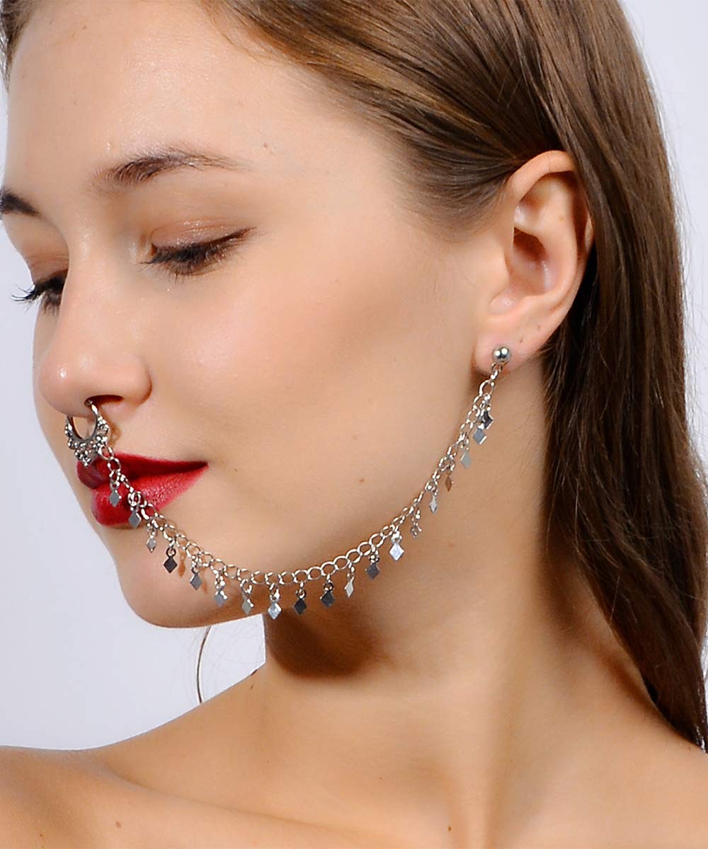 the nose ring chains are designed with C-shaped nose hoops, easy to put on your nose, suitable for septum and can be applied on the side of the nose, polished smooth surface makes them comfortable to wear