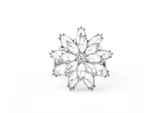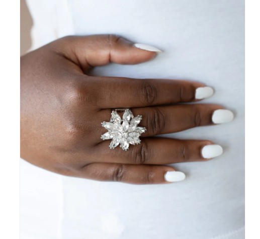 Glittery white rhinestone petals stack into a glamorous floral frame atop the finger, creating a blinding centerpiece. Features an adjustable clasp closure.