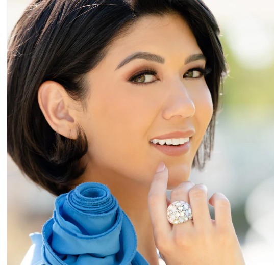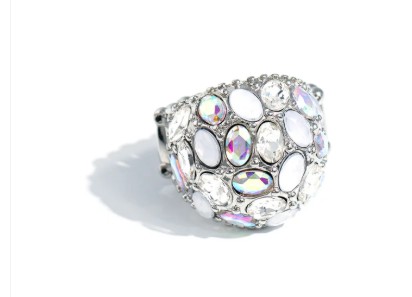 A studded silver frame, filled with blinding oval-cut gems in opalescent, white, and iridescent shades, stands out atop the finger for a blingy statement. Features a stretchy band for a flexible fit. Due to its prismatic palette, color may vary.