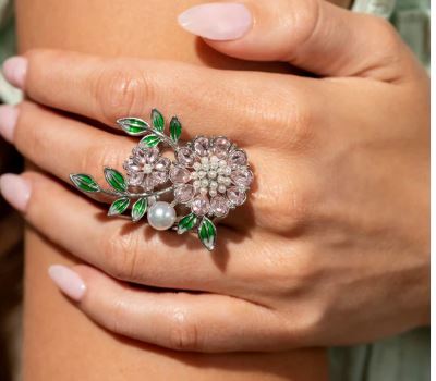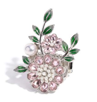 Pink teardrop gems bloom from a collection of white pearls for a floral centerpiece. A smaller flower featuring the same details stacks above the oversized flower while green-painted leaves and a solitaire pearl extend from the duo of flowers for additional whimsy and color. Features a stretchy band for a flexible fit.