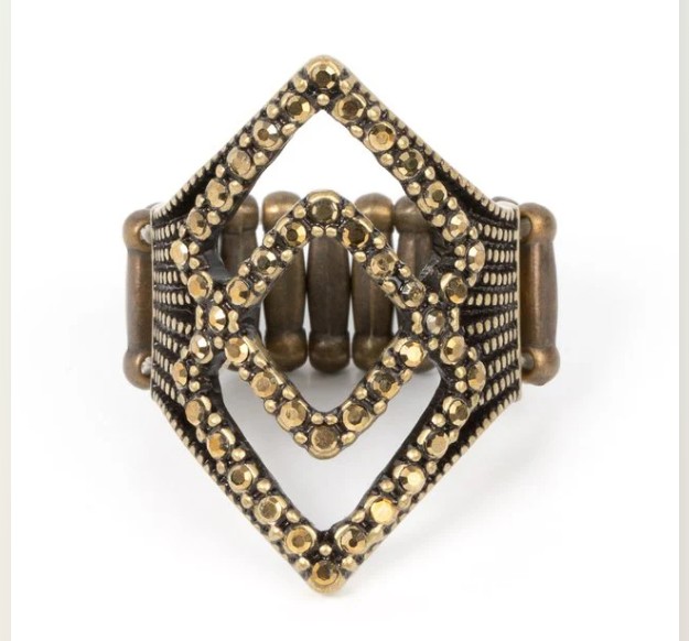 A pair of aurum encrusted diamond shaped frames stacks atop studded brass fittings, culminating into an edgy sparkle. Features a stretchy band for a flexible fit.