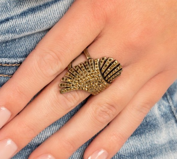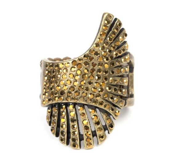 Dainty aurum rhinestones are sprinkled across pillared brass frames that asymmetrically overlap across the center of the finger, culminating into an expressive shimmer. Features a stretchy band for a flexible fit.