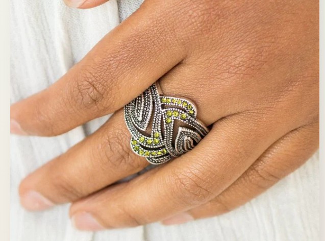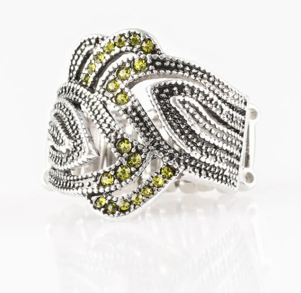 Dress up your outfit with the stunning Paparazzi Ring ~ Fire and Ice – Green. This ring features a flame-like silver frame adorned with glittery green rhinestones, creating a sparkling finish. The stretchy band ensures a flexible fit for all.