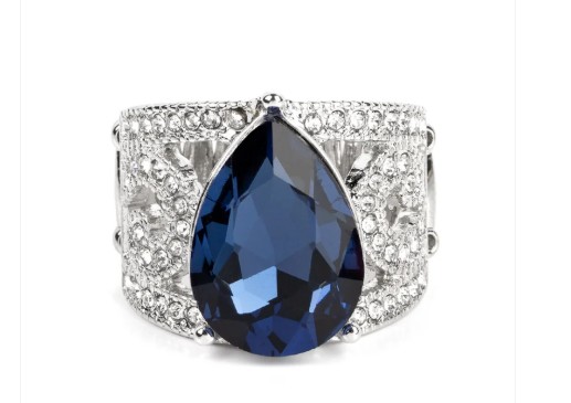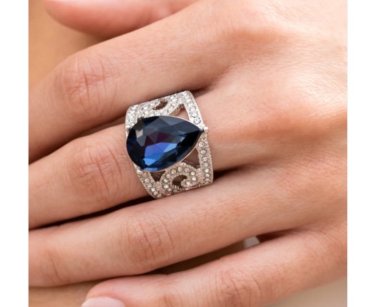 An oversized teardrop gem in the Pantone of Polar Night embellishes the center of a regal, filigree-filled band dotted in glassy white rhinestones, invoking a royal radiance atop the finger. Features a stretchy band for a flexible fit.