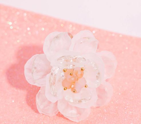 Acrylic petals in a clear and matte finish bloom around a clustered collection of peachy glass beads for an elegantly dainty display. Features a stretchy band for a flexible fit.