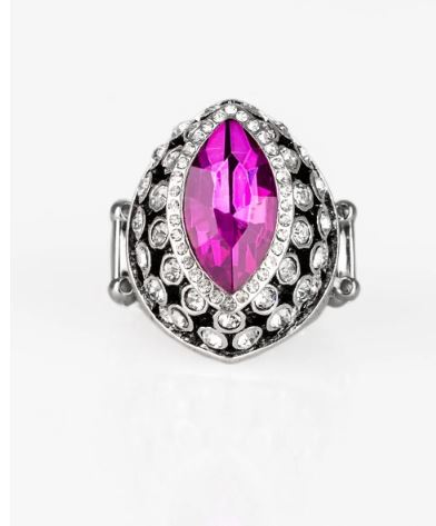 Featuring a regal marquise style cut, a pink rhinestone is pressed into the center of a silver frame radiating with glittery white rhinestones for a blinding finish. Features a stretchy band for a flexible fit.