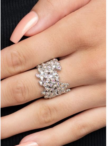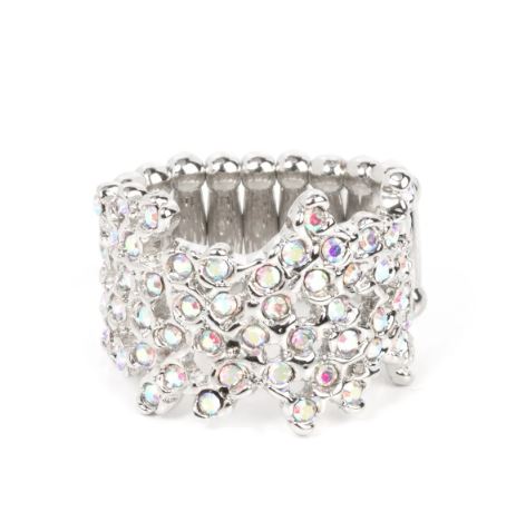 Enhanced with shiny silver fittings, glittery iridescent rhinestones scatter across the finger for a subtle shimmer. Features a stretchy band for a flexible fit.