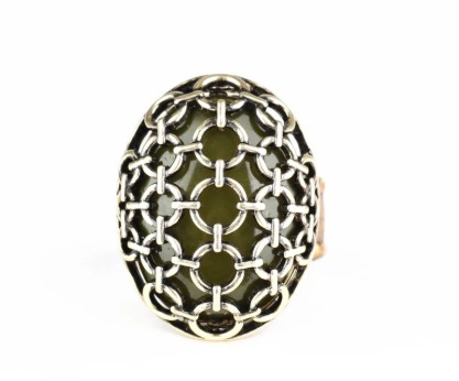 Antiqued brass links connect into a wire-like mesh across the front of an oval green cat’s eye stone, creating a bold statement piece atop the finger. Features a stretchy band for a flexible fit.