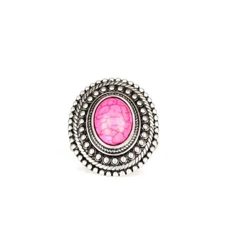 Chiseled into a tranquil oval, a vivacious pink stone is pressed into the center of a shimmery silver frame spinning with studded patterns for a seasonal flair. Features a stretchy band for a flexible fit.