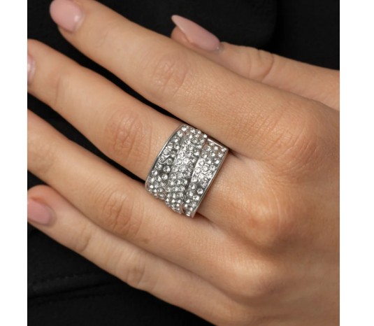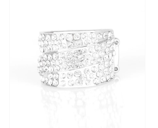 Row upon row of glistening white rhinestone stack into an incandescent display. An additional row of sparkling rhinestones wraps diagonally across the band for an extra splash of refined shimmer.