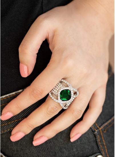 Featuring a regal cut, a dramatic green rhinestone is nestled between interweaving white rhinestone encrusted bars atop a thick silver band stacked in row after row of white rhinestones for a statement-making look. Features a stretchy band for a flexible fit.