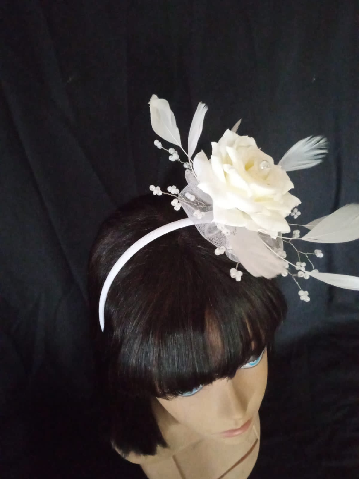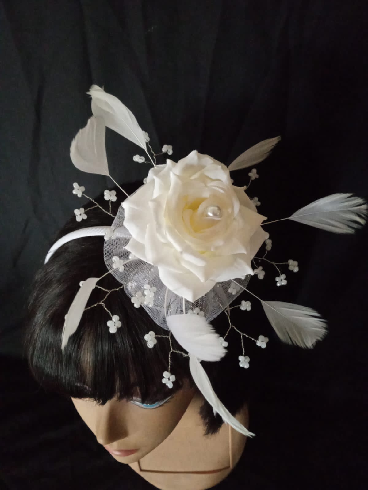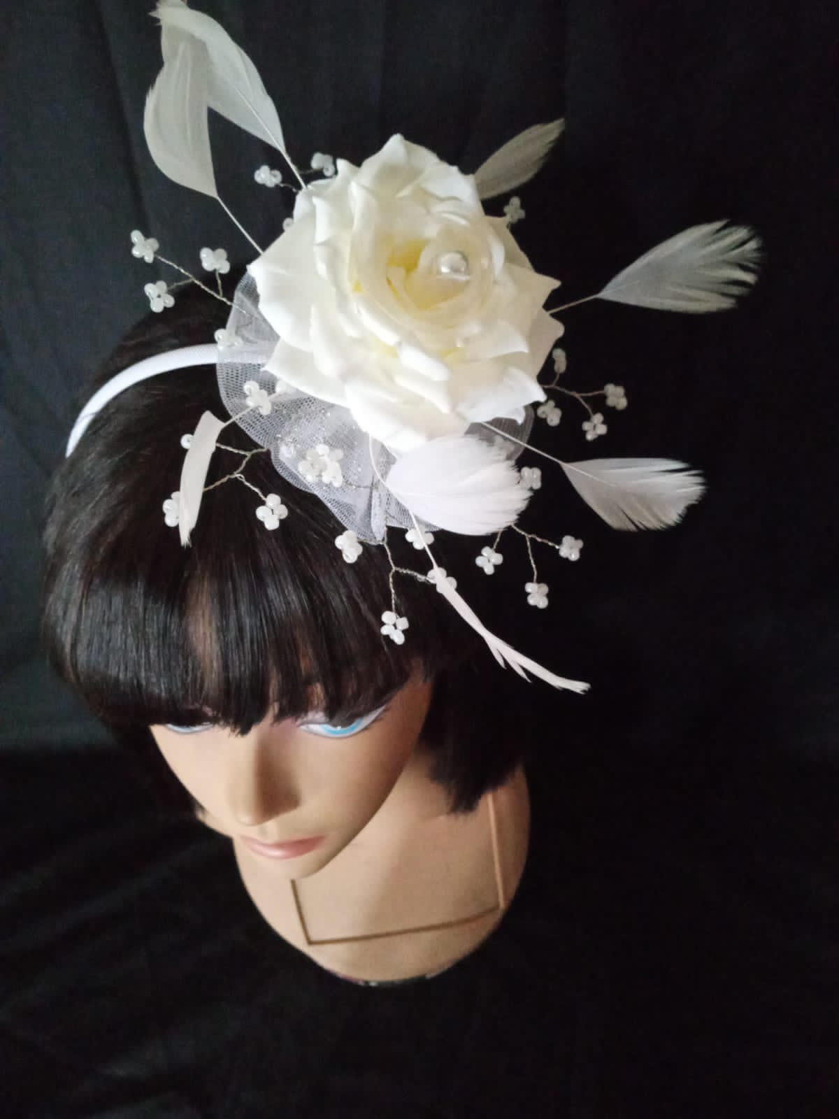 Custom made cream/white floral fascinator with feather lashes and pearl beaded wire sprays. This beautiful hair accessory can be used for church, weddings or any other special occasion to match and complete your outfit. This lovely piece is available at Costume Island Antigua. For orders please call 268-721-0368