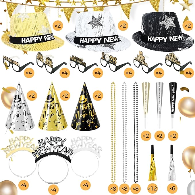 Rich New Year Party Supplies: The New Year party supplies set includes 6 new year eve top hats, 6 cone hats, 12 glitter tiaras, 24 pairs of glasses, 24 beaded necklaces, 18 party blowers, 6 party horns. All party accessories can quickly enhance the party atmosphere, allowing everyone to enjoy a joyful and celebratory night, and are the best decorations to welcome the New Year.